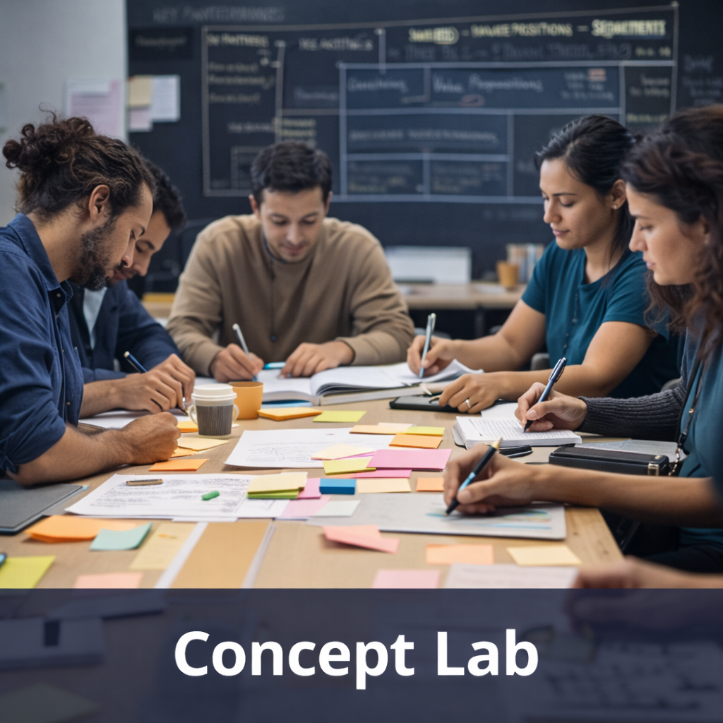 Espacio controlado donde se desarrollan, refinan y prueban conceptos innovadores de manera iterativa. Combina investigación cualitativa y cuantitativa con workshops de co-creación junto a consumidores y clientes.